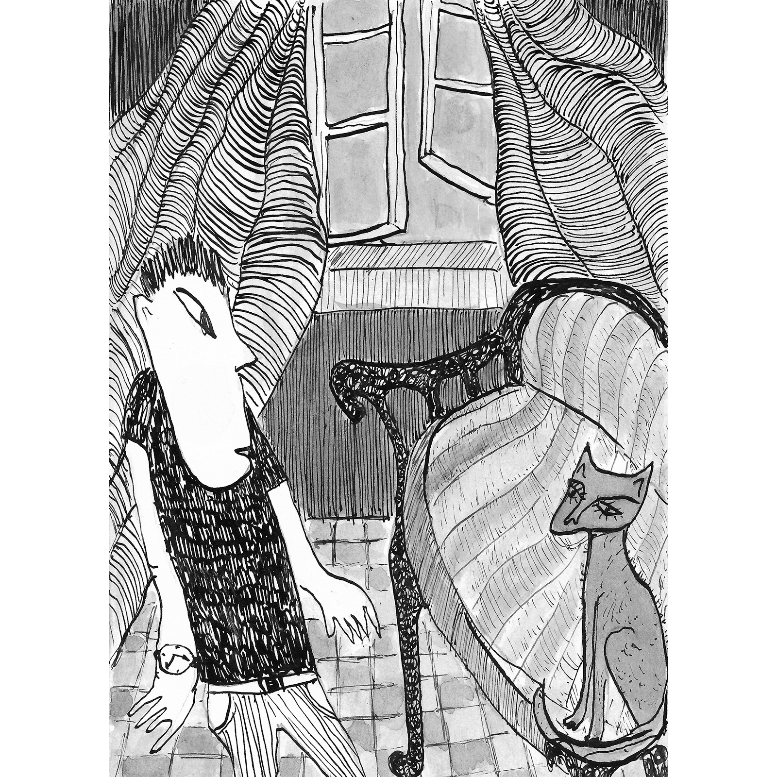 Eu moro aqui perto com um amigo meu. Vivemos num primeiro andar com vista para um quintal cheio de gatos que vagueiam pela nossa varanda. Muitas vezes os gatos tentavam entrar pela janela. Mas nós afugentávamo-los. Um dia cheguei a casa e estava um gato na cama do Luís. Esqueci-me da janela aberta. Corri com ele e no dia seguinte fui de férias. Quando voltei o Luís tinha vendido tudo o que tinha tecido naquela casa. Sofás, colchões, cortinados e tapetes desapareceram. O gato tinha pulgas.